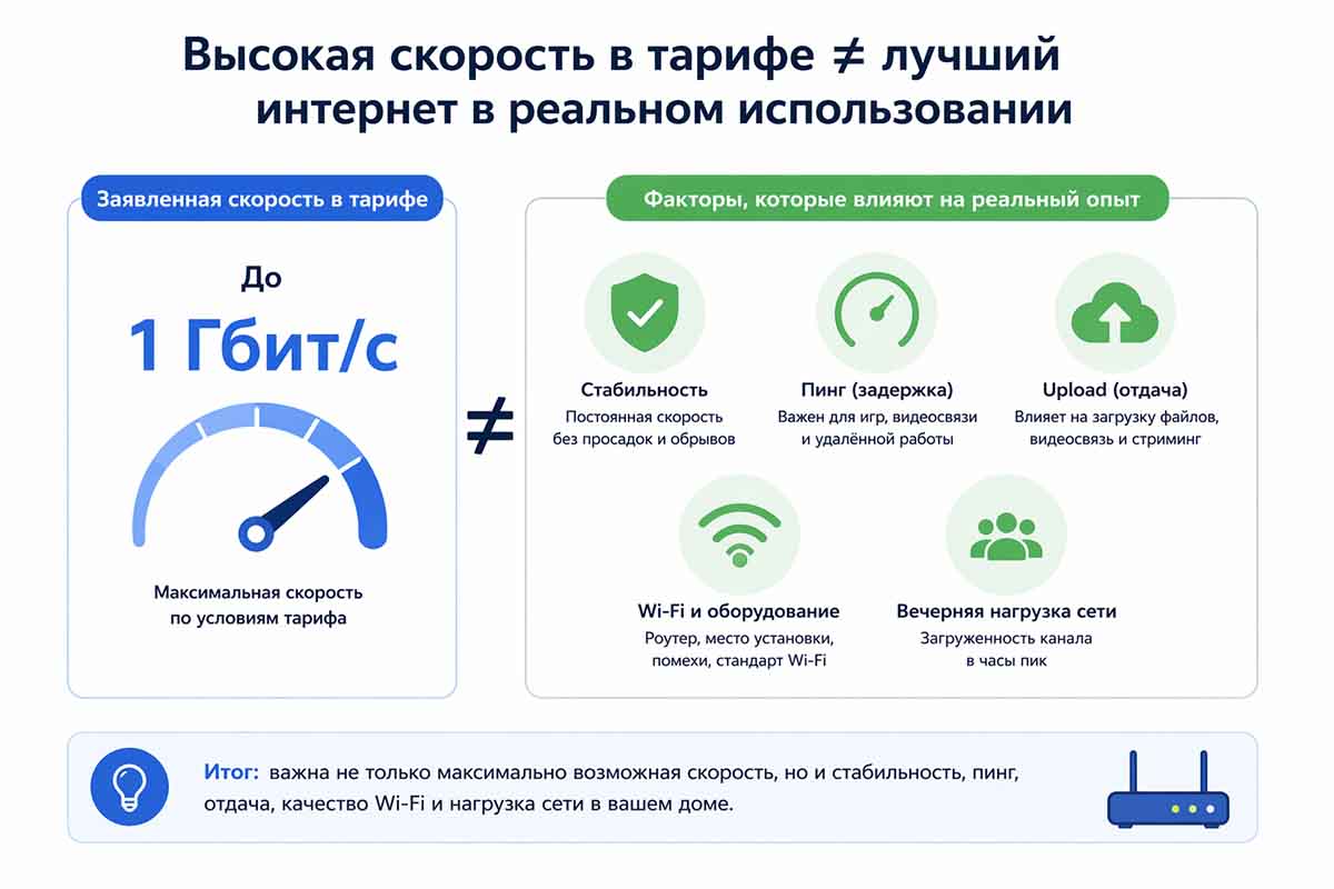 На практике важна не только сама аббревиатура, но и то, как она реализована именно в вашем доме. Условный гигабитный тариф на хорошей оптической инфраструктуре и при нормальной домашней схеме может дать один опыт, а тот же “до 1 Гбит/с” при слабом роутере, загруженном Wi-Fi и неудачном месте установки оборудования — совсем другой.